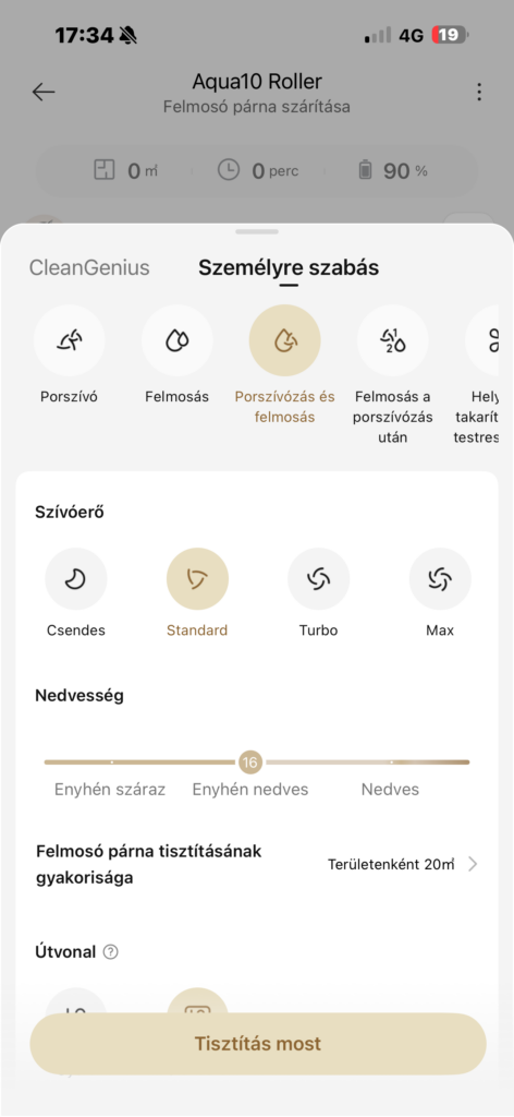 Finomíthatunk itt olyan beállításokat is, minthogy a felmosás során csak nagyon minimális nedvességet használjon, de intelligensen mossa a felmosót.