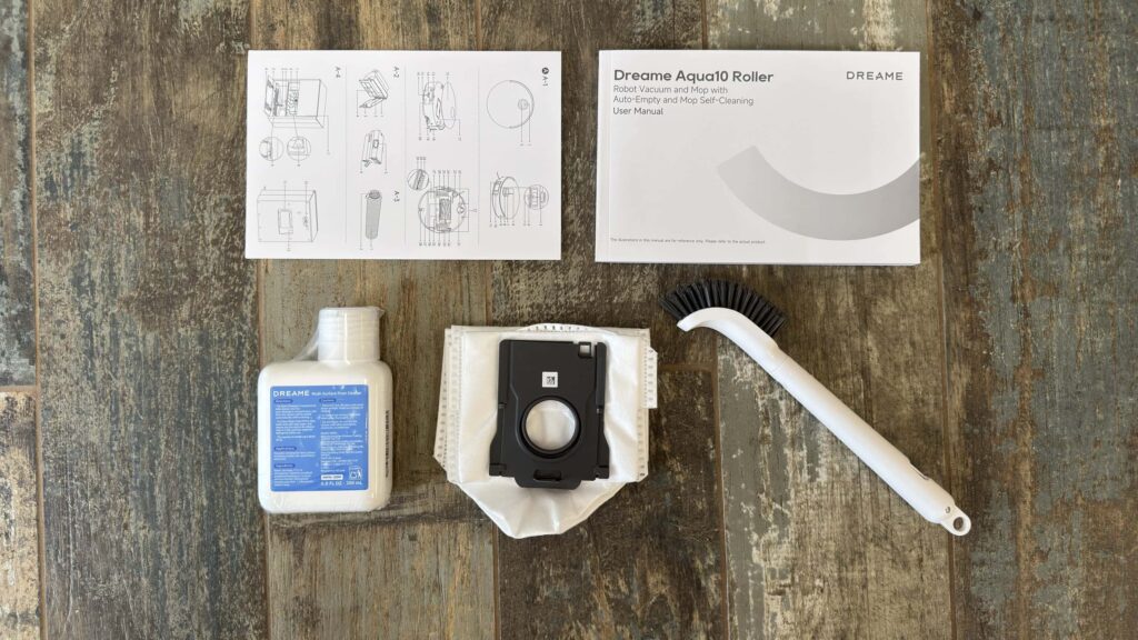 A porszívó mellett ott lesz a dokkolóállomás, amivel egy teljesen új irányban indult el a Dreame, alacsonyabb, tömzsibb kialakítású, mint a korábbiak, de találhatunk még hozzá egy rámpát, egy extra porzsákot, egy tisztítókefét, felmosófolyadékot, illetve természetesen papír alapú használati utasítást is.