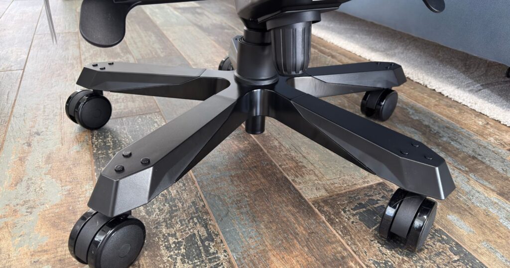 Nagyjából 10-15 perc alatt nagyon kényelmes tempóban széket lehet varázsolni az alkatrészekből. Mi azzal indítottuk, hogy a masszív fémből készült, csillag alakú talpazatba belepattintottuk a kerekeket, majd beleállítottuk a hidraulikát, így gyakorlatilag kész is volt az alsó rész.