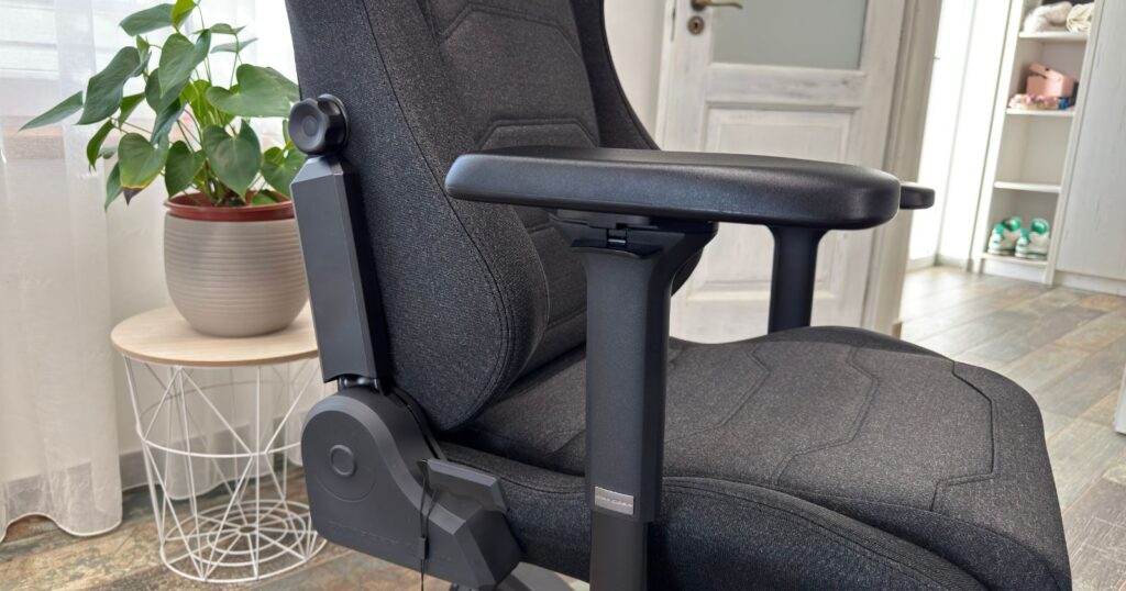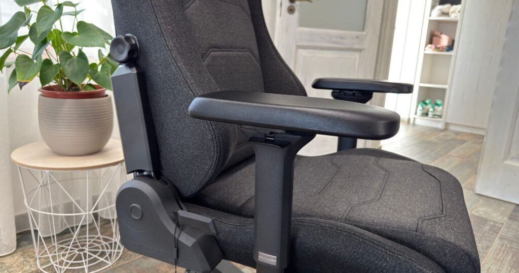 Aminek viszont örültünk, mert nagyon kevés gyártó foglalkozik vele, az a kartámaszok rendkívül széles körben történő beállítási lehetősége. Három fokozatban szabályozhatjuk, hogy jobbra, balra vagy inkább középre pozícionáljuk, csúsztathatjuk előre és hátra, sőt négy fokozatban módosíthatjuk a magasságot is.