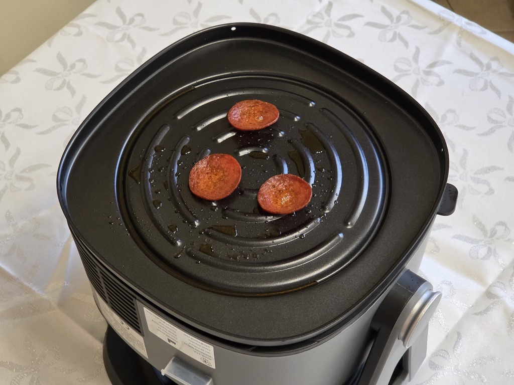 Természetesen kipróbáltuk a grill funkciót is. Szalámi chipset készítettünk vele, és kifejezetten jól sikerült, kellemesen ropogós lett, de azért készüljünk fel rá, hogy minél zsírosabb fogást teszünk rá, annál jobban serceg és fröcsköl majd, így érdemes a konyhának azt a részét választani hozzá, ami könnyen tisztítható.