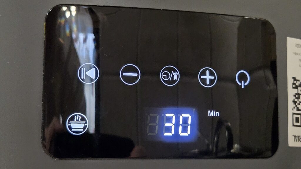 Konkrétan az air fryer irányítása kifejezetten egyszerű. Öt érintőgomb van rajta, a bekapcsolón túl tudjuk állítani az időtartamot és a hőfokot pozitív, illetve negatív irányba, de találunk rajta a sütés indítására és leállítására szolgáló gombot is.