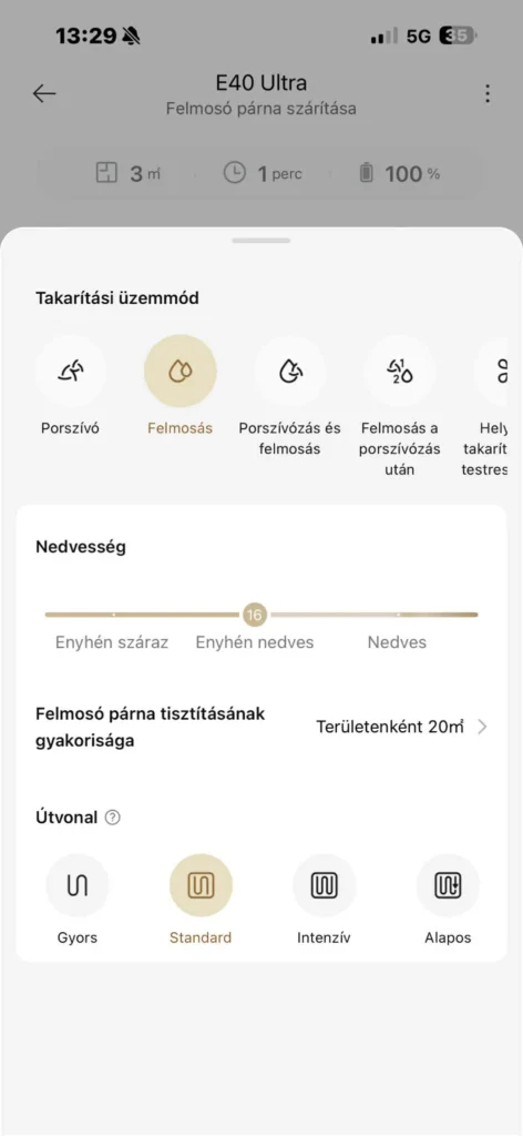 Természetesen csak rajtunk múlik az is, hogy milyen gyakran tisztítsa meg a felmosópárnákat – négyzetméterenként állítható –, de a felmosáshoz leadott nedvesség mértékét és az útvonal alaposságát szintén az app segítségével módosíthatjuk.