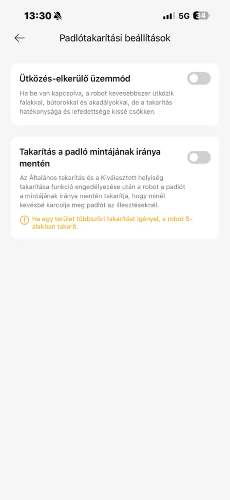 Plusz pont, hogy beállíthatjuk: a porszívó kövesse a padló mintáját a takarításkor vagy sem. Hasznos extra, ami kiegyensúlyozottabb takarítást kínál, akárcsak az ütközés elkerülő mód állíthatósága, amit mi mindig kikapcsoltunk, mert így pontosabb volt a munkavégzés.