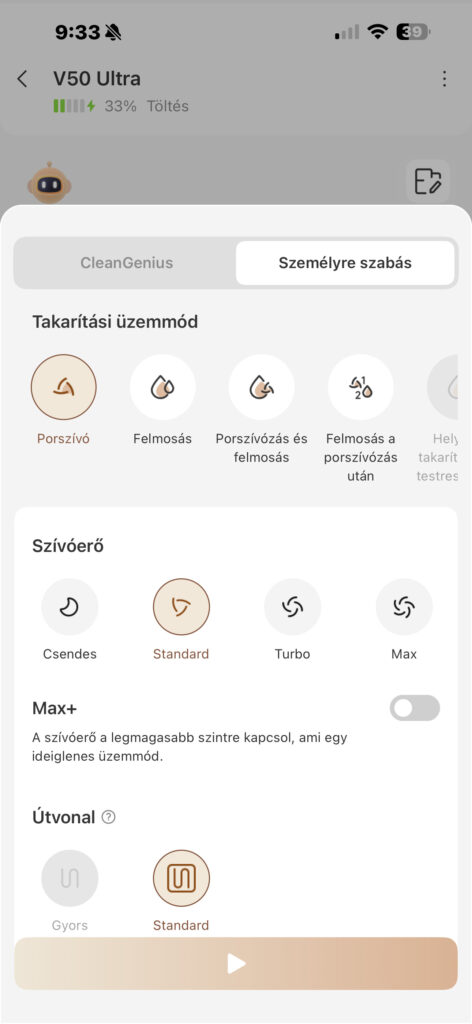 Módosíthatjuk például a tisztítási beállításokat, automatizálhatjuk a teljes folyamatot, de rábízhatjuk az AI-ra is a felmosópárna tisztítását, sőt mi dönthetjük el, hogy milyen mosási üzemmódot alkalmazzon (takarékos, standard, alapos), illetve milyen vízhőmérsékleten dolgozzon (forró, meleg, enyhe, takarékos).