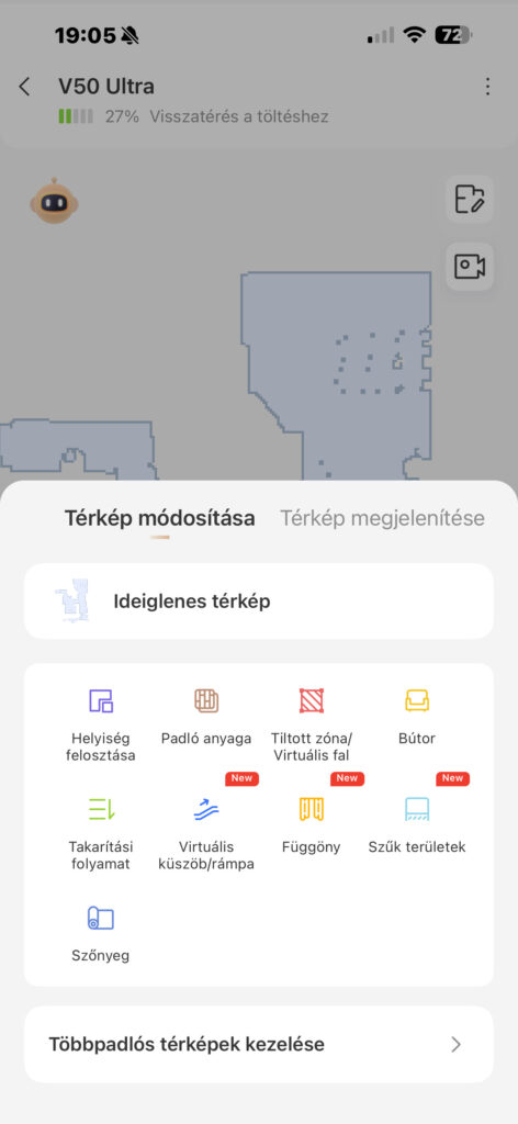 A legfontosabb, hiszen lehetőségünk nyílik részletesen testre szabni a lakás teljes alaprajzát, kijelölni azokat a helyeket, ahová a robot nem mehet be, megadni a padló összetételét (bár ezt a szenzorok is felismerik), újraoszthatjuk a helyiségeket, elnevezhetjük őket, sőt bútorokat, virtuális küszöböket adhatunk hozzá.