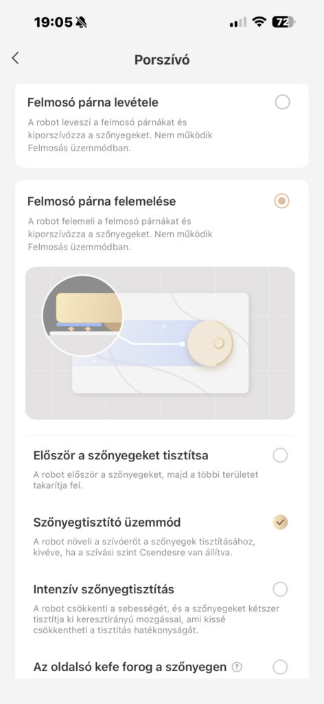 A szőnyegtisztításnak több beállítása is van, állíthatjuk intenzívre, megadhatjuk neki, hogy minden esetben a szőnyegekkel kezdje a munkát, sőt az oldalkefe szőnyegen történő forgását egyaránt itt kapcsolhatjuk ki vagy be.