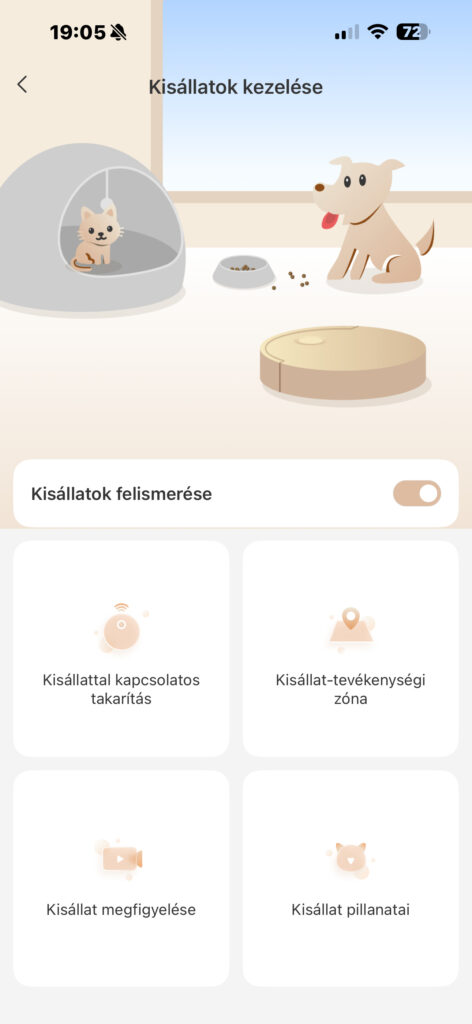 Bekapcsolás esetén a porszívó jobban odafigyel a kisállatokra, sőt felismeri őket, érzékeli a területüket, amelyeket alaposabban, intelligensebben takarítja majd.