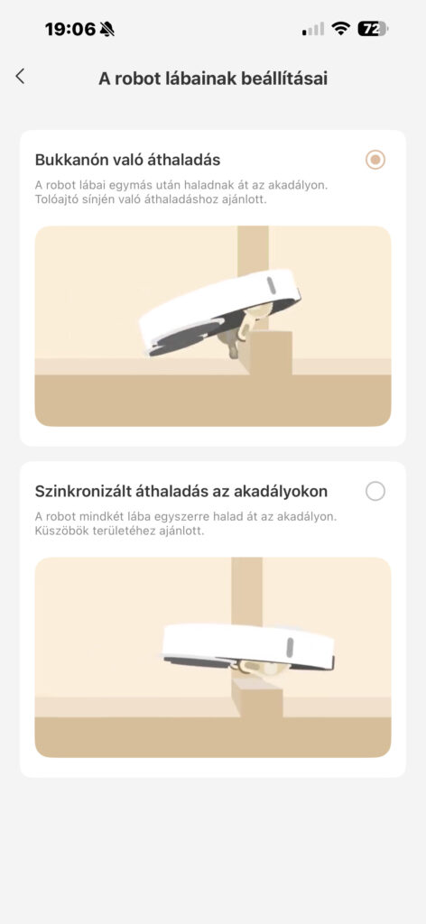 A küszöbmászás során a MOVA terméke robotlábakat használ az akadályok leküzdéséhez. Itt két fontos beállítást találhatunk, és úgy gondoljuk, hogy érdemes kipróbálni mindkettőt, mert küszöbfüggő, hogy mikor és melyik lesz a hatékony.