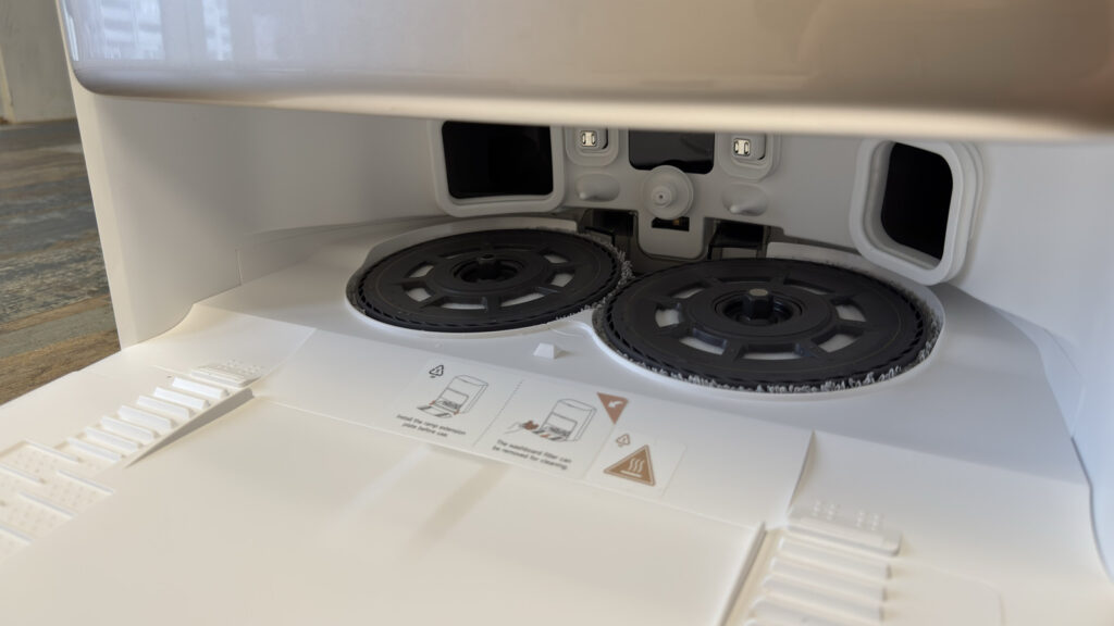 Ha a kis robot végzett a felmosással, akkor képes 80 Celsius fokos forró vízzel átmosni a mopokat a dokkolón, ami tapasztalataink szerint nagyon hatékony. Valóban kimossa belőlük a koszt, a szennyeződéseket, sőt a hőfok alapján a baktériumok jelentős részét is.