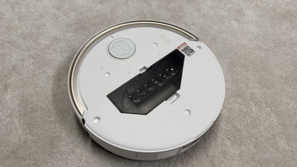 Míg a robotporszívó megjelenése egy kicsit átlagos, addig a dokkoló dizájnja nekünk kifejezetten tetszett. Alacsonyabb és tömzsibb kialakítású, mint a többség, a külső jegyek tekintetében pedig követi a fehér alapszínt az aranyszínű berakásokkal.