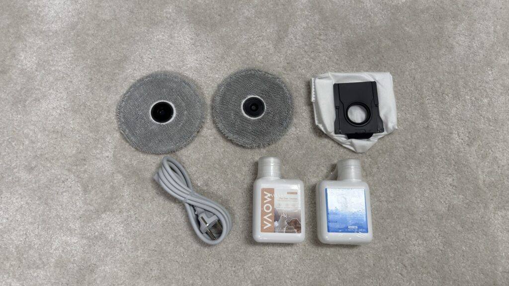 A dobozt kinyitva megtalálhatjuk benne a robotporszívó mellett a multifunkciós dokkolót (benne a porzsákkal és a víztartályokkal), a rámpát, amelyen keresztül a robot be tud állni az állomásra, egy pár felmosó mopot, töltőkábelt, kétféle tisztítószert (egy simát és egyet kisállatokhoz), valamint egy rakás papírt.
