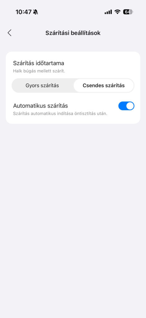 Itt többféle mód közül válogathatunk. Ha nem zavar a hang (nagyjából 58 dB), akkor 5 perc alatt is végezhet, de beépítettek a tervezők egy csendesebb üzemmódot is, ami 30 percig szárítja a felmosót, cserébe viszont csak 43 decibellel dolgozik.