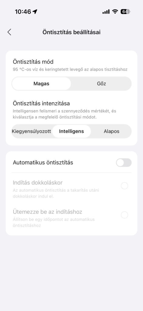 A társalkalmazás részeként lehetőségünk nyílik például arra, hogy beállítsuk az öntisztító módot. Teljesen automatizálhatjuk a folyamatot, de módosíthatjuk az intenzitást is, ahol szintén választható külön intelligens mód, de válogathatunk kiegyensúlyozott és alapos megoldások közül.