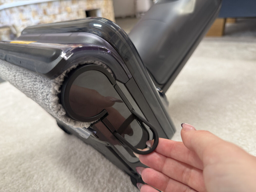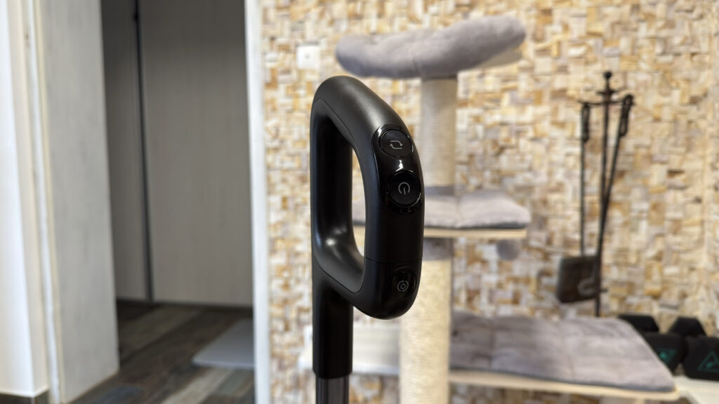 Az ergonomikus kialakítású nyél természetesen fizikai gombokat is tartalmaz – összesen hármat –, amelyek a módváltást, a ki- és bekapcsolást, valamint a moptisztító funkciót indítják.