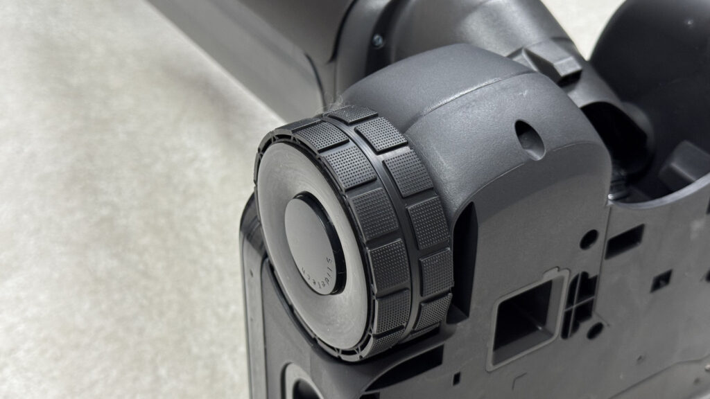 A kerekek nagyon puhák, nagyon sima haladást biztosítanak, és kétségtelenül a legjobbak, amit egy ilyen porszívónál láthattunk. Nagyszerűen beirányítható a sarkokba, könnyen tisztít a szegélyek mentén, a feje egyszerűen forgatható, sőt 180 fokban hajlik, tehát még bútorok alá is könnyedén betolható, viszont, ha nem érnénk el egy bútor alatti pontot, a porszívót akár telefonnal is irányíthatjuk, így magától bemegy alá.