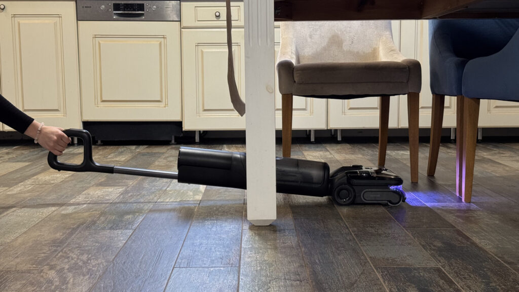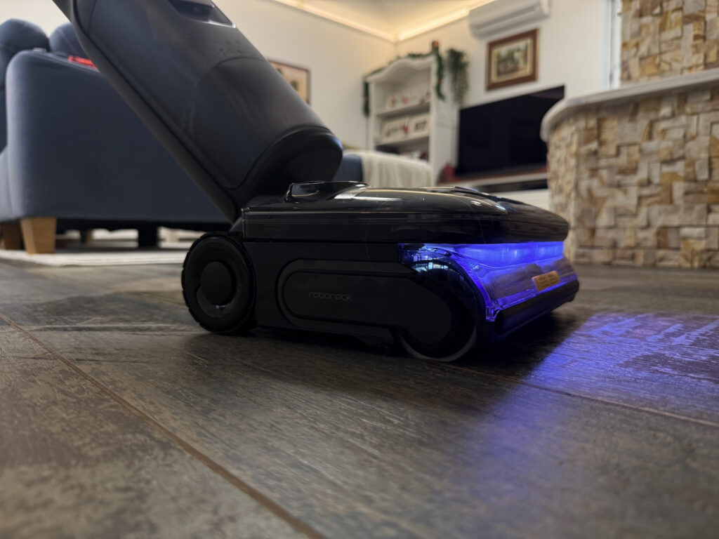A takarítást ráadásul – egyébként minden üzemmódban – egy kellemes kék színű LED segédfény támogatja meg, ami nagyon jó, de az árnyalat szempontjából nekünk jobban tetszett, amit a Dreame porszívókban láttunk.