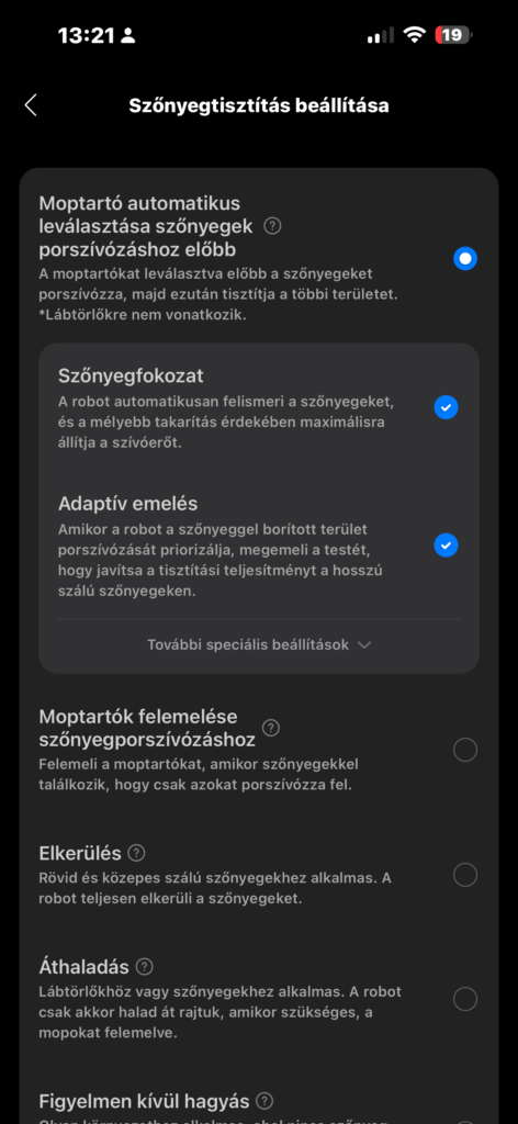 Itt választhatjuk ki, hogy sima szőnyegfokozatban dolgozzon (automatán felismeri és magasabbra állítja a szívóerőt), vagy inkább mély szőnyegtisztítást kérünk (minden helyiségben maximális erővel dolgozik), hogy leengedje-e az oldalkefét (rövidebb szálú szőnyegeknél hatékonyabb), sőt még azt is, hogy a szőnyegszegélyek mentén található vezetékeket elkerülje.
