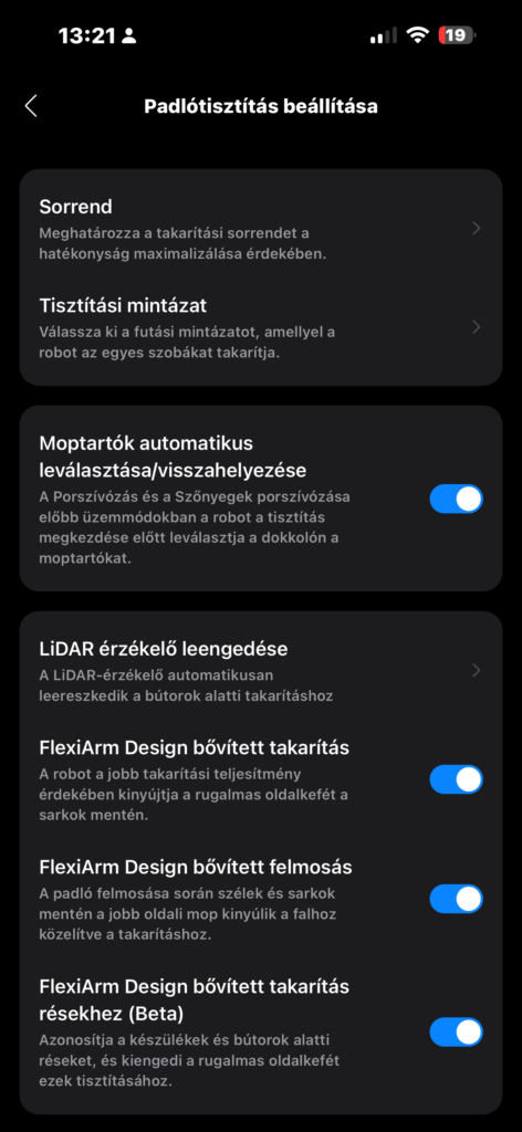 A FlexiArm a kinyúló oldalkeféhez és mophoz kapcsolódó beállításokat tartalmazza. Kérhetünk itt bővített takarítást és felmosást, sőt béta üzemmódban bővített takarítást a résekhez is.