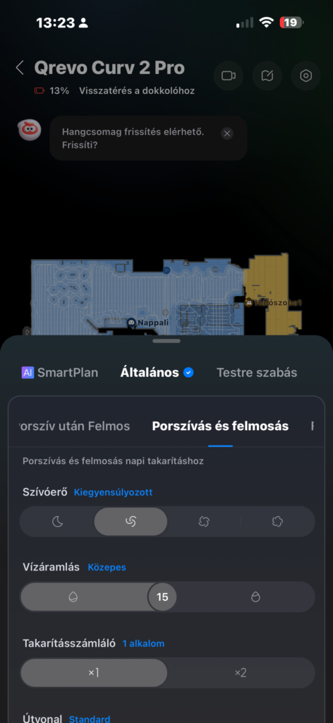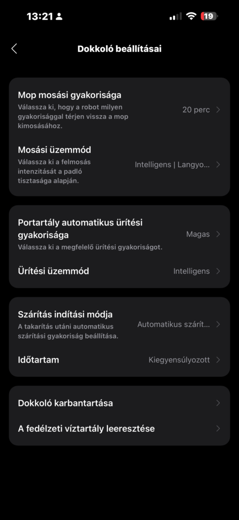 - Mop mosás gyakorisága: Módosíthatjuk, hogy helyiségenként vagy bizonyos időközönként akarjuk kitisztíttatni a mopot. Sajnos négyzetméterenkénti beállítási lehetőség továbbra sincs, ezt mi nagyon hiányoltuk.