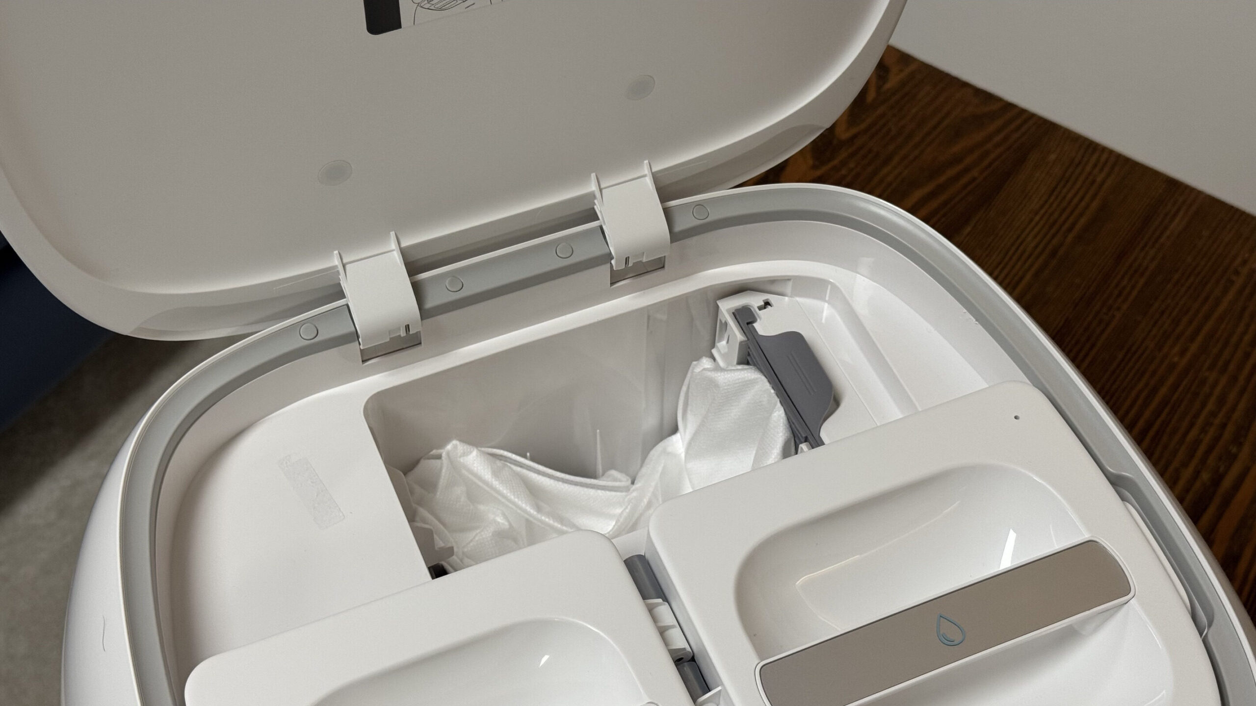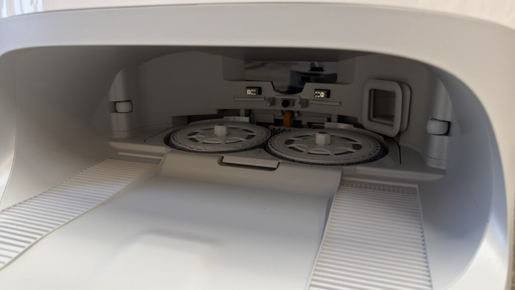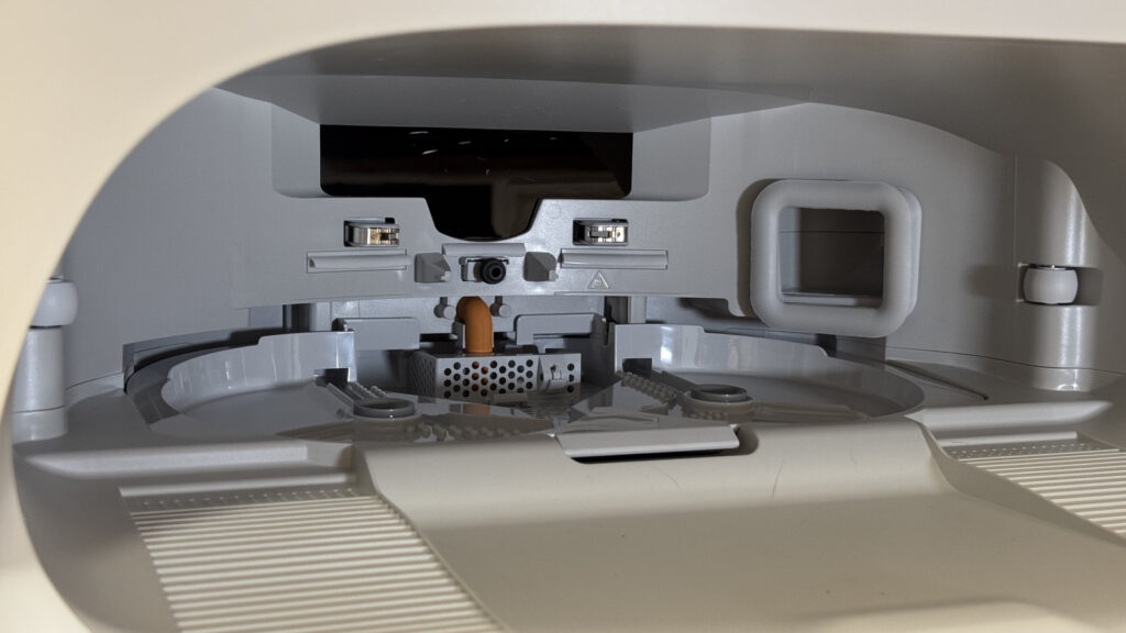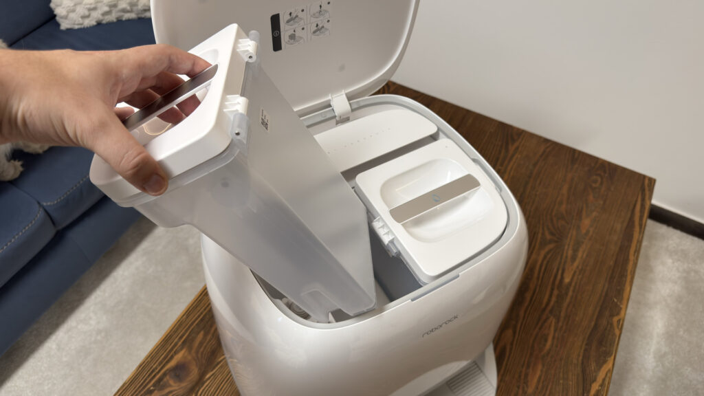 Ez valójában egy 2,5 literes porzsák, ami elég nagy ahhoz, hogy elegendő legyen csak 7 hetente cserélni, illetve üríteni. Az ürítés zajos, de még így is sokkal halkabb, mint a legtöbb robotporszívónál, maga a folyamat pedig teljesen pormentesen zajlik, ami allergiások számára kifejezetten jó hír.