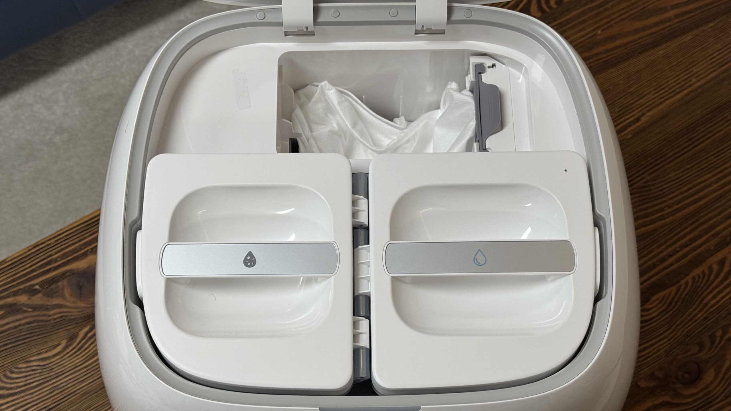 Amint azt már fentebb is említettük, a dokkolóban két víztartályt is találunk. Az egyik a tiszta víz tárolására szolgál, míg a másik a mopmosás során keletkező szennyvíz gyűjtésére. Mindkettőben van szenzoros szintérzékelő, ami az appon keresztül tud figyelmeztetni minket, ha esetleg utántöltésre vagy ürítésre lenne szükség.